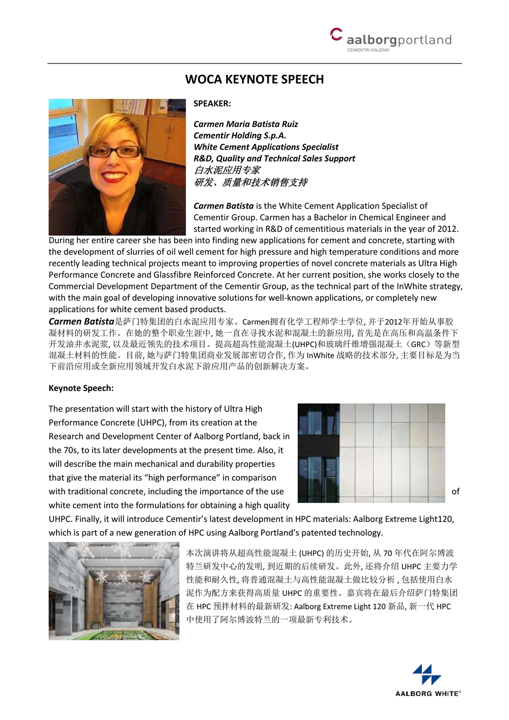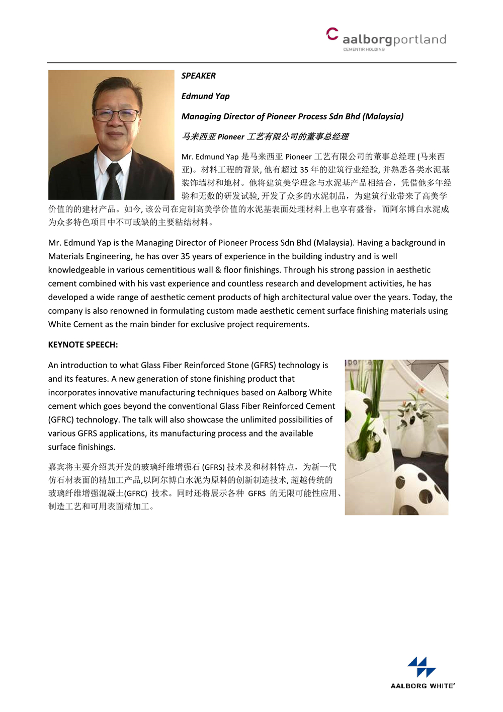 來自阿爾博丹麥白水泥應(yīng)用專家Carmen女士將在現(xiàn)場發(fā)表關(guān)于薩門特集團(tuán)最新研發(fā)的產(chǎn)品演講,以及來自馬來西亞Pioneer Process的Edmund Yap帶來GRC在園藝品中的多年成功應(yīng)用經(jīng)驗(yàn)。