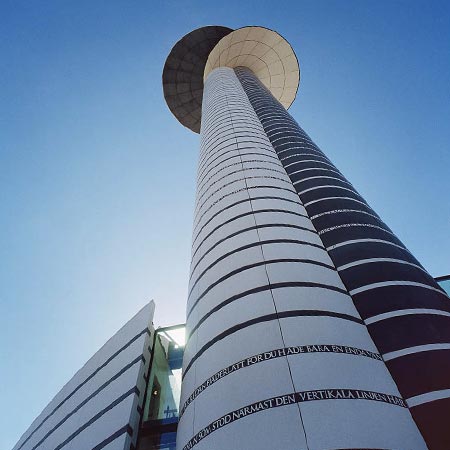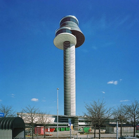 由建筑師Gert Wing?rdh設(shè)計(jì)的具有雙色主體和交錯(cuò)平面的頂部結(jié)構(gòu)的阿蘭達(dá)控制塔,比起功能性控制塔,更接近現(xiàn)代主義雕塑??刂扑谴笮汀芭艿?”項(xiàng)目中的一部分。