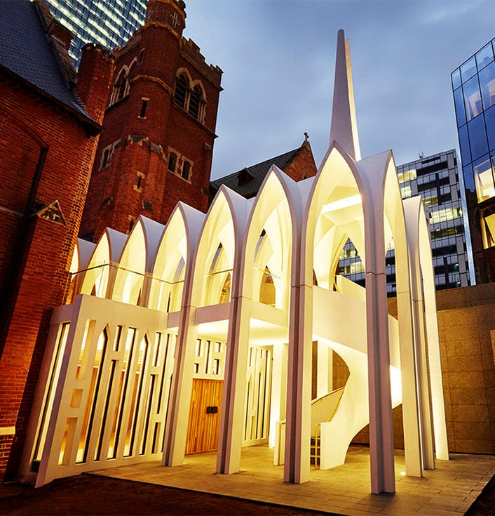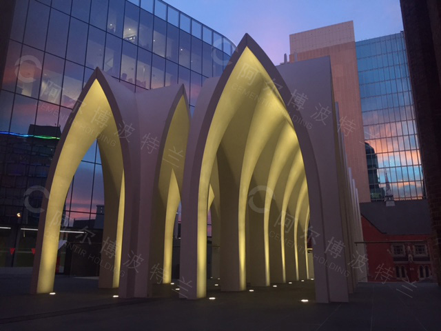 項目的靈感來源于大教堂的柳葉刀型窗戶,其引人注目的白色預(yù)制混凝土外墻通體使用阿爾博白水泥。預(yù)制構(gòu)件是由阿德萊德SA Precast公司研發(fā)生產(chǎn),包括輕微紋理狀白色混凝土曲線梁的排練室、尖塔、格子狀的墻板,U形柱支撐的白色混凝土預(yù)制板的拱門從一樓延續(xù)到二樓形成廊柱。