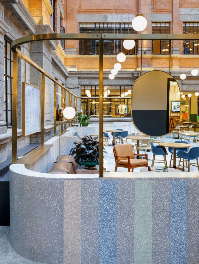 這幢位于市中心的始建于上世紀(jì)的老式磚房當(dāng)時(shí)是一座鴉片廠,之后成了一名藝術(shù)家的住所,這次再次的翻新是做了細(xì)致的考慮的,全部的設(shè)計(jì)元素都是設(shè)計(jì)師為了表達(dá)一種看似漫不經(jīng)心,卻又能為在其中辦公的人們提供最周到服務(wù)的現(xiàn)代化辦公空間而精心安排的。大廳采用阿爾博?白水泥混合多種顏料形成簡(jiǎn)潔明快的現(xiàn)澆水磨石地面。阿爾博?白水泥作為極具表現(xiàn)力的原材料產(chǎn)品,賦予建筑師和設(shè)計(jì)師無限的靈感。